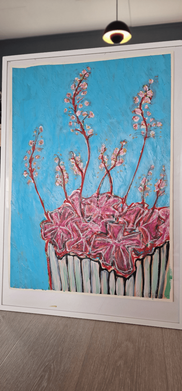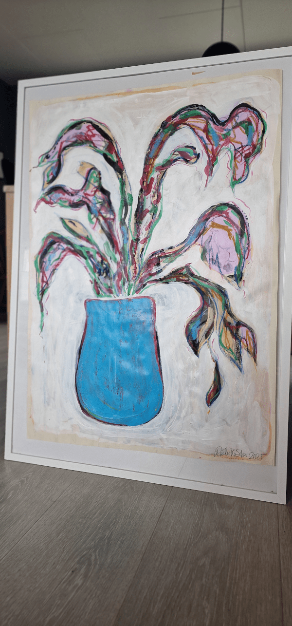 I denne serien tar jeg utgangspunkt i tørkede blomsterbuketter – en flora i grenselandet mellom liv og død. Jeg er fascinert av hvordan visne planter, selv i sin oppløsning, rommer skjønnhet, minner og verdighet. Gjennom lag på lag med akryl, oljestift, kull og akvarell, maler jeg frem en verden der det organiske og det dekorative møtes: støvete kronblader, krokete stilker, glisne blader og muggent liv.